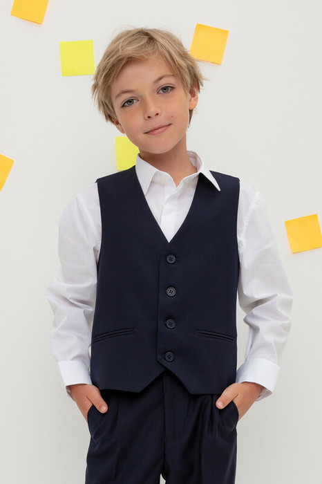 Классический школьный жилет для мальчика. Cпереди застёгивается на пуговицы. По бокам два ложных кармана. Сзади ремешок для регулировки жилета по ширине.