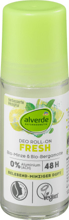 Эффективная формула шарикового дезодоранта Fresh от Alverde NATURKOSMETIK с экстрактом бергамота и экстрактом перечной мяты, полученной в результате контролируемого органического выращивания, обеспечивает 48-часовую защиту без добавления солей алюминия. Мягкая формула с глицерином питает кожу и обеспечивает длительное ощущение свежести. Свежий аромат мяты, бергамота и эфирных масел оказывает бодрящее действие. Рецепт без микропластика и водорастворимых, чисто синтетических полимеров.