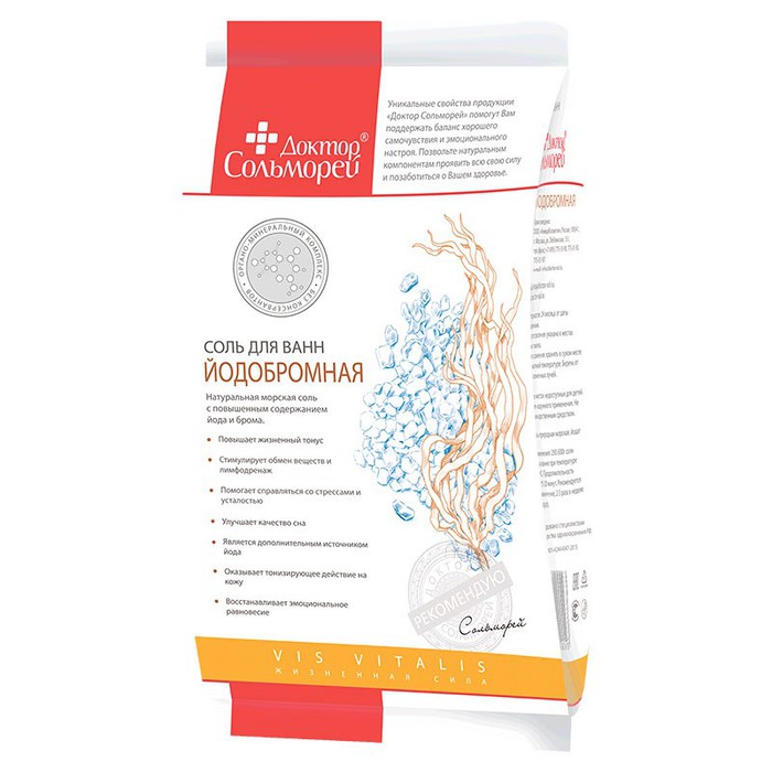 Натуральная морская соль с повышенным содержанием йода и брома Доктор Сольморей помогает справлятся со стрессами и усталостью, стимулирует обмен веществ и лимфодренаж, повышает жизненный тонус.