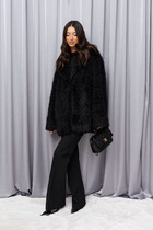 Верхняя часть выполнена из текстурированной меховой ткани, создающей уютный и объемный эффект. Нижняя часть и детали отделки выполнены из гладкой, сияющей экокожи, добавляющей образу динамики и современности.