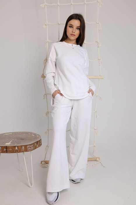 Очень интересный хлопковый  свитшот  с отделкой из аталаса.  Изделие имеет фигурный с разновеликой длинной низ. Хорошо подойдет под брюки № 5165 или № 5166