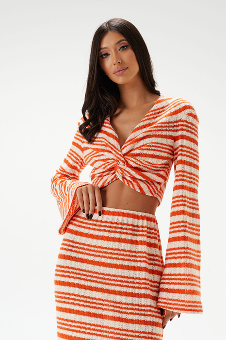 Джемпер прямого кроя выполнен из трикотажного полотна декоративным элементом в виде узла. Характеристики: прямой крой,глубокий вырез, рукав втачной, расширяется к низу. Длина изделия по спинке 41см, длина рукава от края горловины 83 см