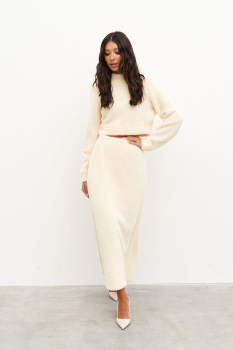 Джемпер свободного укороченного кроя,выполнен из трикотажного фактурного полотна бежевого цвета. Характеристики: воротник-стойка, укороченная длина, спущеный рукав. Длина по спинке 40 см, длина рукава от горловины 78 см.