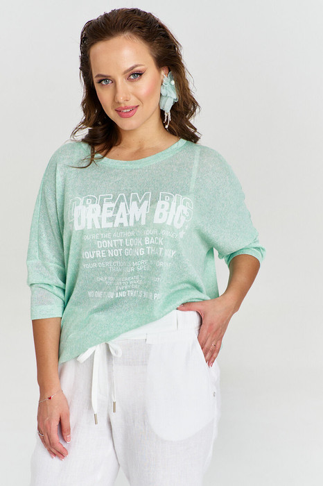 Джемпер из тонкого вискозного трикотажа, свободного силуэта, "оверсайз", с круглой горловиной с отрезной бейкой. Линия плеча спущена. Рукав 3/4, зауженный. На переде авторский принт.
