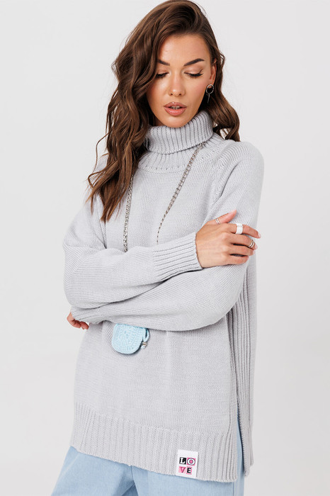 Джемпер удлинённый трикотажный вязанный с длинным рукавом-реглан. По переу нашивка «LOVE». Внизу по боковым швам разрезы. Горловина - стойка с отворотам, по краю которого нашивка «BUTER».