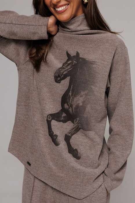 Джемпер из трикотажного полотна с велюровым эффектом прямого силуэта со спущенной линией плеча. Рукав втачной. По переду печать "Лошадь" и нашивка с гравировкой "BUTER". Низ джемпера по переду фигурный ассиметричный. Внизу по правому боковому шву обработан разрез. Воротник-стойка цельнокроеный.
