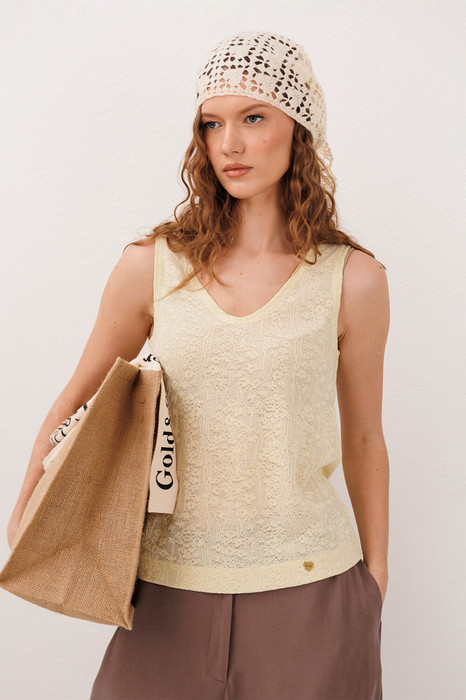 Джемпер трикотажный, без рукавов. По переду и спинке V-образный вырез. По переду нашивка.