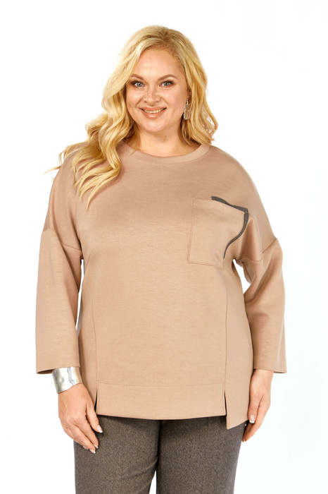 Очень удобная, уютная блуза из трикотажного полотна. Изделие полуприлегающего силуэта. Горловина аккуратной округлой формы. Рукав втачной, линия плеча спущена полной длины. Декоративным элементом является накладной карман, который выполняет не только практичную, но и эстетичную функцию, добавляя изделию стиль и индивидуальность. Низ ассиметричный в боковых швах предусмотрены разрезы. Спинка со средним швом.