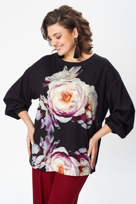 Джемпер свободного силуэта из трикотажной ткани с принтом. Рукав втачной одношовный со складками по низу и манжетой. Горловина лодочкой обработана планкой. В боковых швах по низу разрезики.  Длина джемпера - 68 см, длина рукава джемпера - 53 см.
