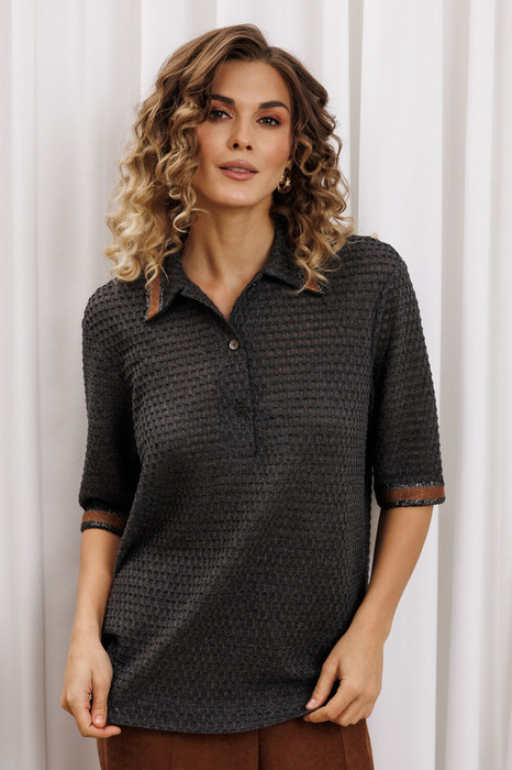 Джемпер прямого силуэта из трикотажного трикотажного ажурного полотна. Перед с застежкой поло и нагрудными вытачками. По воротнику и низу рукава настрочена декоративная тесьма. Длина джемпера - 69 см, длина рукава - 32 см.