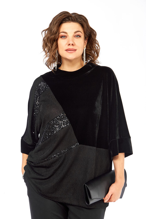 Джемпер женский, нарядный, свободного кроя. Выполнен путем комбинирования трикотажного полотна и бархата, с декоративными вставками пайеток по переду. Горловина обработана воротником стойкой. Рукава цельнокроеные с притачными манжетами.