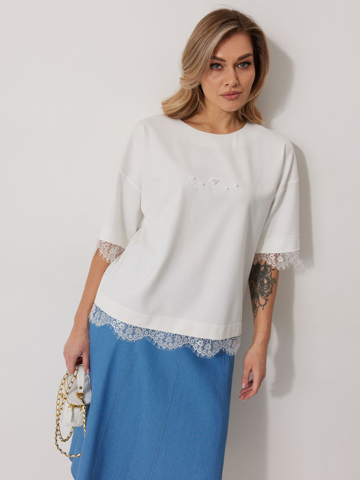 Джемпер женский прямого силуэта со спущенной линией плеча.  По переду авторская печать декорированная бусинами. Горловина округлой формы, обработана обтачкой. Рукав втачной одношовный, 3/4 длины. Низ изделия и низ рукава обработаны притачным ажурным кружевом.