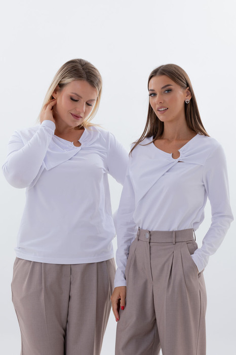 Центральным элементом дизайна становится декоративная кокетка по переду, увенчанная фирменным металлическим кольцом. Эта деталь — не просто украшение, а скульптурный акцент, добавляющий образу архитектурную четкость и современное звучание. Кольцо становится холодным, весомым контрастом нежности мягкого футера.