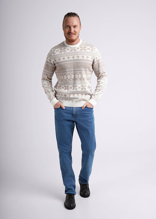 Джемпер мужской с округлой горловиной, длинным рукавом на манжете и поясом. Прекрасно сохраняет тепло, комфортный в носке. Оригинальности модели придает орнамент.