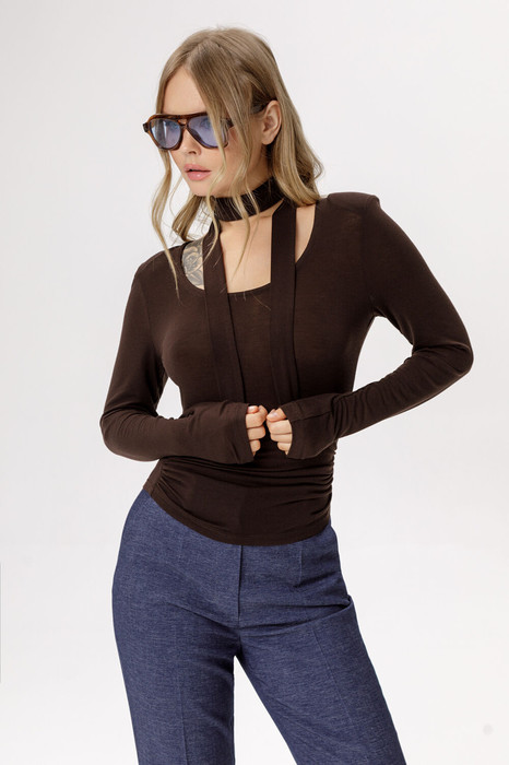 Трикотажный полупрозрачный джемпер со съемным шарфиком.
