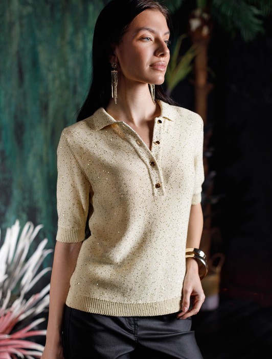 Состав: 90%Хлопок 10%ПЭ Плотность: 5 GGЛегкий джемпер поло бежевого цвета с коротким рукавом выполнен из хлопковой пряжи с вкраплением сияющих пайеток, что придает особую изысканность. Стильный джемпер связан изнанкой, пряжа отличается легкостью и приятной текстурой, совершенно не колется, обеспечивает комфорт даже при длительном использовании, а натуральные волокна поддерживают оптимальный температурный баланс. Крой полуприлегающий, подчеркивает женственный силуэт, а отложной воротничок с застежкой на золотистые пуговицы и манжеты на рукавах гармонично завершают дизайн, создающий аккуратный образ. Нарядный джемпер подойдет девушкам и женщинам больших размеров, в нем вы будете чувствовать себя уверенно и свободно в любой ситуации. Мерцающий эффект пайеток добавляет образу выразительности и индивудуальности. Сочетайте джемпер в романтическом образе с пышной юбкой, в более строгом с широкими брюками. С этим поло легко создать премиальный лук в стиле old money. Мерцающее полотно добавляет особого шарма вашему образу, делая его уместным как на праздник, так и для повседневного выхода. Новый год, вечеринка или любое другое мероприятие пройдут ярко — сияющие пайетки создают ощущение праздника в каждом движении.