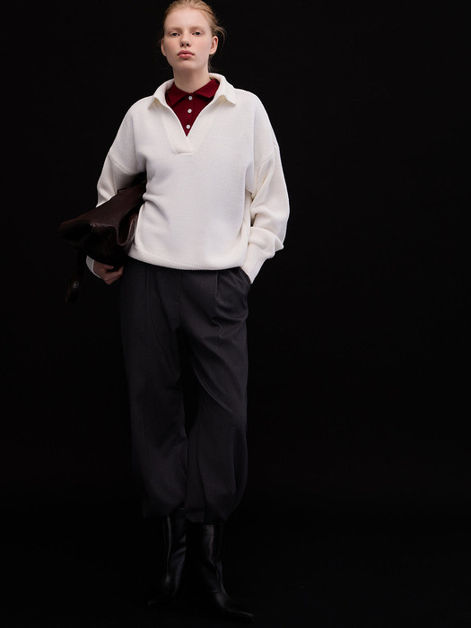 Джемпер-поло свободного кроя с отложным воротником — одна из ключевых моделей Aim Clo, к которой наши клиенты возвращаются из сезона в сезон. Спущенная линия плеча и V-образный вырез формируют мягкий, открытый силуэт и сохраняют ощущение свободы в движении.