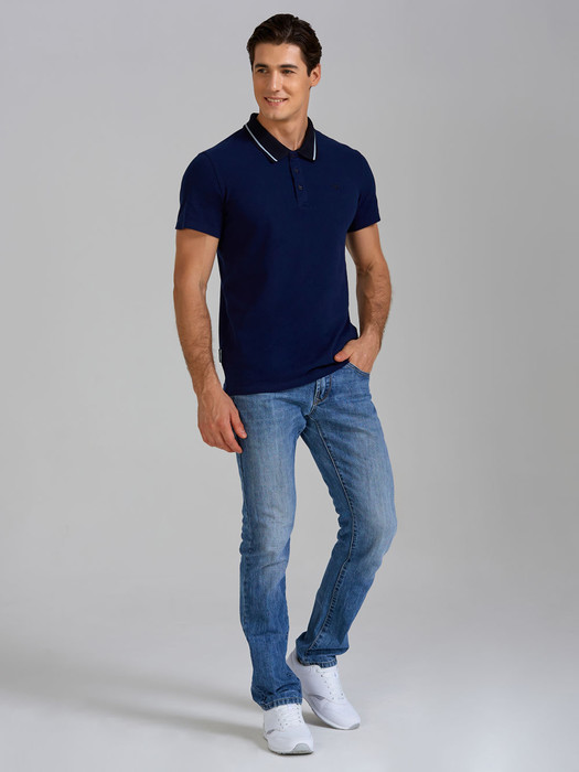 Футболка-поло из хлопкового полотна "пике". Классическая модель поло с короткими рукавами. Воротник и манжеты рукава выполнены из трикотажной рибаны темно-синего цвета с белой полосой. На полочке застежка-планка на пуговицах. На полочке вышивка "R". По низу футболки в боковых швах выполнены разрезы, обработанные тесьмой.
