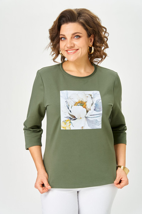 Джемпер женский из трикотажной хлопковой ткани (двунитка). По переду расположен принт. Рукав втачной 3/4, прямой. Вырез горловины круглый, оформлен бейкой с необработанными краями.