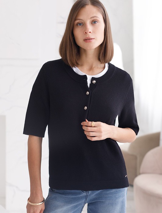 Состав: 70%Хлопок 21%ПА 9%Кашемир Плотность: 12 GG Размер товара на первом фото: 42Джемпер тонкой вязки выполнен из хлопка с добавлением кашемира. Модель с круглым вырезом дополнена золотистыми пуговицами. Мягкая и очень приятная пряжа совершенно не колется, сохраняет тепло при этом не перегревая, гарантируя безупречный комфорт.