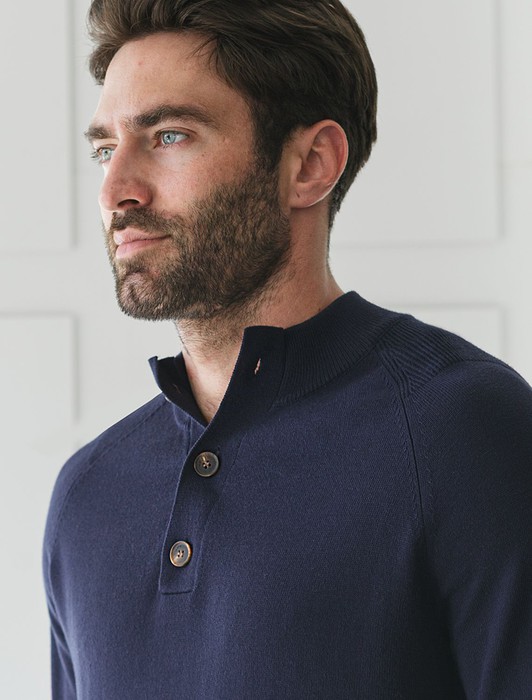 Состав: 55%Хлопок 45%ПАН (акрил) Параметры модели на первом фото: Рост 190, бюст 108, талия 87, бедра 104Темно-синий джемпер с воротом, застегивающимся на черепаховые пуговицы, связали из мягкого хлопка с добавлением акрила; состав, который отлично согревает, не колется и при этом не перегревает тело, поэтому вещь получилась максимально комфортной для переменчивой погоды. Повседневный образ поддержат светлые брюки, синие джинсы и броги.