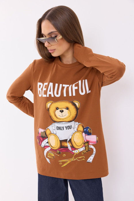 Джемпер прямого силуэта из трикотажного полотна. Горловина круглой формы. Рукав прямой удлинённый  с отверстием для большого пальца. На переде выполнена печать.