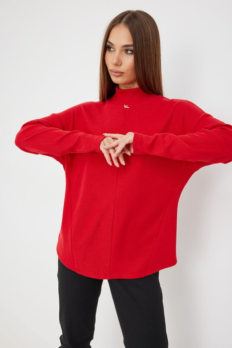 Джемпер свободного силуэта со спущенной на руку проймой. По горловине притачная стойка. По бокам джемпера фигурные подрезы.
