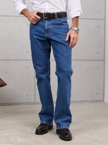 Мужские классические джинсы с пятью карманами. Посадка Comfort fit (свободные по бедру), высокая талия, широкие в колене и по низу. Застежка на молнии. Выполнены из традиционной хлопковой ткани denim, цвет ткани Blue/Black (лицевая сторона ткани темно-синяя, изнаночная сторона темно-серая). Классическая темная стирка с потёртостями только по швам. Параметры указаны для размера 32. Длина внутреннего шва 83,0 см.