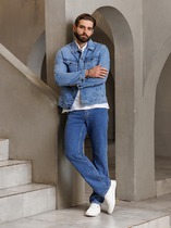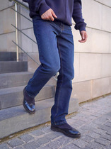 Мужские модные джинсы с пятью карманами. Посадка Slim fit (облегающие по бедру), средняя талия спереди, высокая сзади.. Застежка на молнии. Немного зауженные к низу. Боковой шов сделан в разутюжку . Выполнены из слабоэластичной ткани denim comfort stretch, цвет ткани Black/Black (лицевая и изнаночная стороны ткани черные). Средняя стирка с потёртостями и "усами" спереди и потёртостями сзади. Основной оттенок ткани после стирки темно-серый.