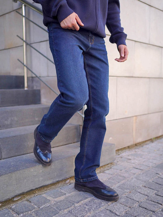 Мужские классические джинсы с пятью карманами. Посадка Regular fit (полуоблегающие по бедру), высокая талия, немного заужены к низу. Застежка на молнии. Выполнены из слабоэластичной ткани denim comfort stretch. Боковой шов сделан "в разутюжку", к нижней части шва пришита специальная декоративная тесьма "selvadge", имитирующая контрастную кромку джинсовой ткани. Темная стирка со слабовыраженными потёртостями и "усами" спереди и потёртостями сзади.Джинсы дополнительно чуть-чуть подкрашены в желтый цвет для получения эффекта "GET DIRTY", т.е. эффекта запачканных джинсов.