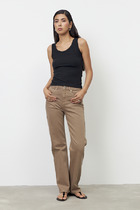 Джинсы О-образные от бедра, укороченные, на   поясе  со шлевками. Высокая посадка. Спереди и сзади вертикальные подрезы, которые конструктивно делают брюки более объемными.  Функциональные карманы  спереди. На задних половинках накладные карманы и классическая фигурная кокетка. Эти джинсы отлично сочетаются с футболками “овер”, прямыми топами, свободными рубахами и блузами, а так же прекрасно дополняют образ в сочетании со свободным жакетом в стиле Casual.