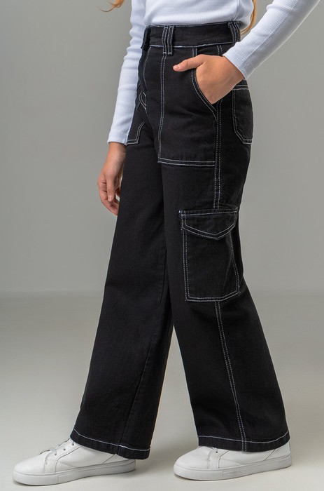 Добавьте в гардероб девочки стильные черные джинсы палаццо с высокой посадкой — идеальный выбор для создания ярких образов! Подростковые брюки с накладными карманами карго станут настоящим хитом, позволяя юной девушке чувствовать себя комфортно и уверенно.