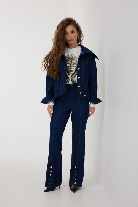 Брюки из джинса, прямого кроя, слегка расширенные к низу. Высокая посадка, пояс притачной, застежка спереди на молнию и джинсовую пуговицу. По переду боковые карманы, вертикальные швы заканчиваются шлицей с петлями и пуговицами, сзади под кокеткой накладные карманы.