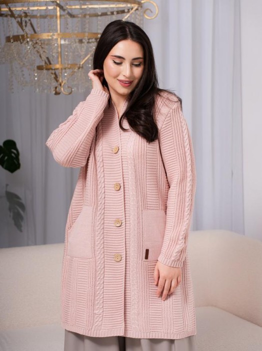 Совместные покупки Сургут Женская одежда Кофты, кардиганы — ESENIA Кардиган женский полушерстяной удлиненный с косами - Пудрово-розовый