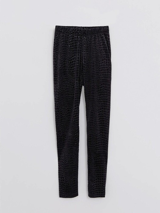 Легинсы женские облегающие без боковых швов из бархатного трикотажного полотна с тиснённым рисунком. Верх изделия обработан широким поясом с широкой резинкой внутри.