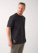 Фуфайка с коротким рукавом среднего объема, с оригинальным принтом, круглым вырезом горловины, которая оформлена обтачкой из рибаны.