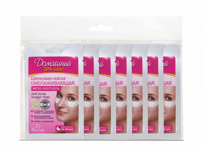 * Шелковая основа с пропиткой из высокоэффективного мезо-коктейля с гиалуроновой кислотой обеспечивает интенсивное питание и увлажнение, устраняет темные круги, восстанавливает эластичность кожи, устраняет «гусиные лапки» и морщинки.