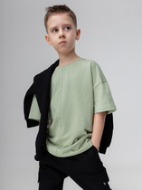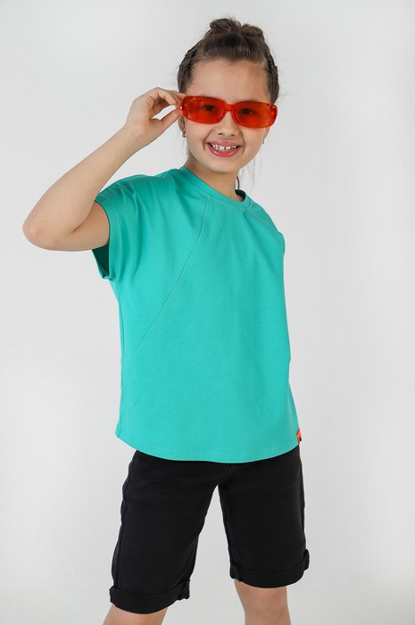 Футболка для девочки, модной объемно-силуэтной формы, свободная в верхней части. Модель с наклонными отстроченными швами по переду и спинке, фигурной линией низа (с небольшим удлинением сзади). Рукава короткие цельнокроенные.