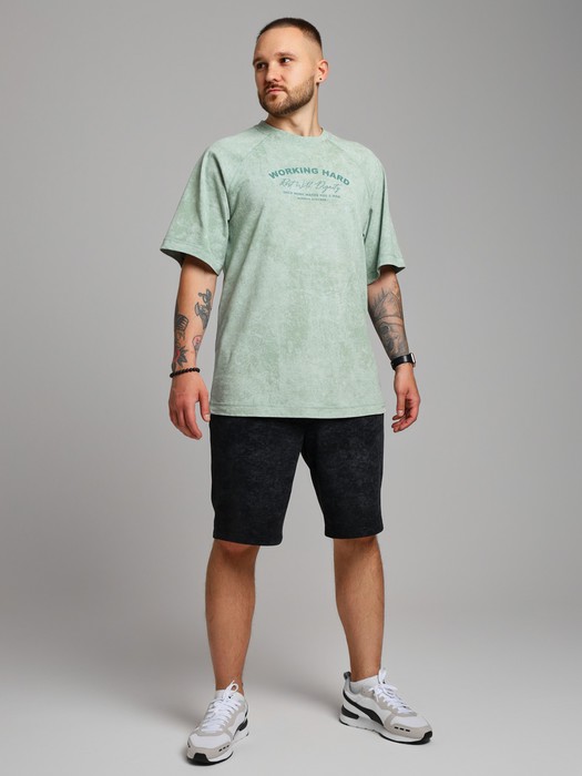 Футболка мужская из трикотажного полотна "кулирка-варенка", с короткими рукавами покроя "реглан", горловиной овальной формы, обработанной втачной планкой, и принтом в центре детали переда, выполненным в технике шелкографии. По швам реглана и горловине настрочены отделочные строчки.