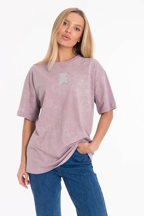 Женская футболка из лёгкой и приятной к телу ткани — отличный выбор для повседневного гардероба. Изготовлена из однотонной кулирки розового цвета, имеет свободный силуэт и круглый вырез горловины. Принт на полочке добавляет изделию оригинальность. Футболка идеально подойдёт для отдыха или домашней носки.