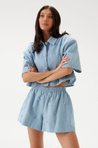 Футболка прямого свободного кроя, выполнена из хлопкового полотна. Характеристики: прямой свободный крой, горловина овальная, рукав слегка спущен, горловина и край рукава выполнены из довяза, по передней части изделия слева декоративная объемная печать "Annete". Длина по центру спинки 69 см, длина рукава 18 см.