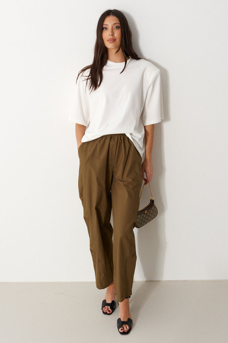 Футболка прямого силуэта. Выполнен из хлопкового полотна белого цвета. Характеристика: вырез горловины круглый с притачной планкой-резинкой. Рукав одношовный, втачной, короткий. Подплечники. Длина по спинке 59 см, длина рукава от горловины 29 см.