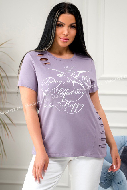 Оригинальная футболка свободного силуэта с интересным и смелым декором по линии плеча и сбоку изделия.Футболка выполнена из мягкого трикотажного полотна оттенка "оберджин".Модель дополнена изящным принтом, который освежает образ.Футболка отлично подойдет для повседневного применения, сочетаясь с джинсами, брюками, шортами и создавая неповторимый образ.