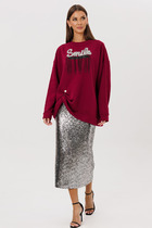 Футболка из хлопковой кулирки, умеренный оверсайз, со спущенным плечом и коротким рукавом. Вырез горловиныкруглый, с необработанной бейкой. Перед декорирован авторским принтом и эффектными прорезями.