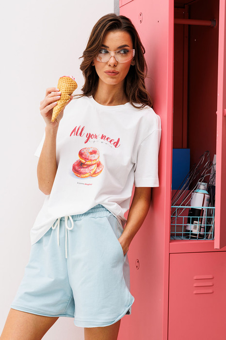 Джемпер прямого силуэта, со спущенной линии плеча. Рукав втачной короткий. Полочка с принтом "Doughnut". По горловине планка из основной ткани.