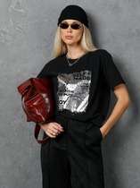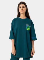 Джемпер выполнен из трикотажного полотна, прямого покроя, длиной до линии бедер. Перед и спинка цельные. Горловина округлой формы. Плечевой шов спущен. Рукав одношовный, длиной до линии локтя. Перед декорирован принтом.