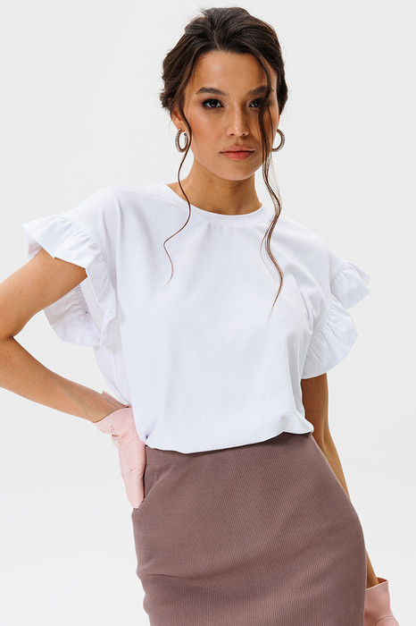 В этой футболке с воланами от GOwear вы не останетесь незамеченной! Вы легко сможете собрать много стильных образов с вашими юбками, шортами, жакетами и брюками!