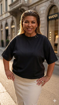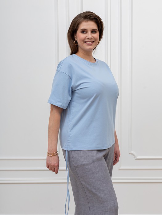 Футболка женская из гладкокрашеного трикотажного полотна «кулирка с лайкрой», полуприталенного силуэта, с короткими втачными рукавами, горловиной овальной формы, обработанной втачной планкой. Модным элементом является регулируемая сборка в боковом шве, выполненная с помощью «кулисы» и продетого в нее шнура.