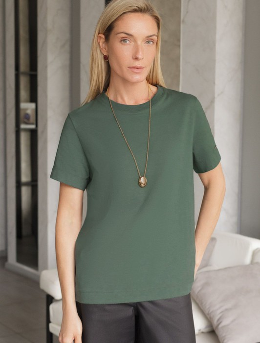 Состав: 92%Хлопок 8%ПУ Параметры модели на первом фото: Рост 172, бюст 88, талия 64, бедра 88Базовая однотонная футболка из премиального хлопка. Горловина выполнена из рибаны в тон изделия, Добавление эластана в состав изделия способствует формоустойчивости. Самое высокое качество хлопковых волокон обеспечивает комфорт в любое время года. Идеально держит форму и сохраняет внешний вид в течение долговременного использования. Универсальная базовая вещь для ваших стилистических решений. Изделие дополнено металлическим логотипом бренда на рукаве.
