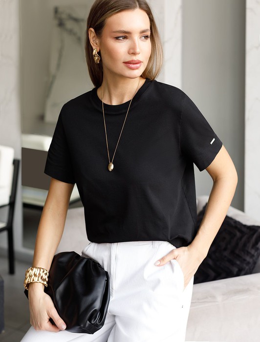 Состав: 92%Хлопок 8%ПУ Плотность: 170 Г/м2 Параметры модели на первом фото: Рост 172, бюст 88, талия 64, бедра 88Базовая однотонная футболка из премиального хлопка. Горловина выполнена из рибаны в тон изделия, Добавление эластана в состав изделия способствует формоустойчивости. Самое высокое качество хлопковых волокон обеспечивает комфорт в любое время года. Идеально держит форму и сохраняет внешний вид в течение долговременного использования. Универсальная базовая вещь для ваших стилистических решений. Изделие дополнено металлическим логотипом бренда на рукаве.